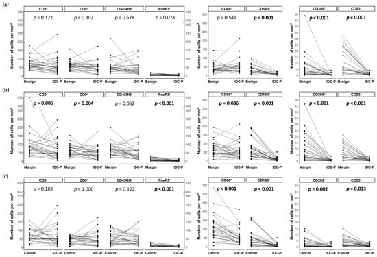 Interestingly, no significant differences were found between the variations in the mean number of T lymphocytes (CD3⁺, CD8⁺, CD45RO⁺ and FoxP3⁺) and CD68⁺ macrophages in the IDC-P compared to the benign tissues (Figure 3a). Indeed, as shown in Figure 3, the decrease in the densities of the T cells in the IDC-P was more balanced, with a considerable number of patients having more positive cells in IDC-P tissues compared to benign tissues. Furthermore, most of the patients had more CD3⁺ (p = 0.006) and CD8⁺ (p = 0.004) T cells and tended to have more CD45RO⁺ T cells (p = 0.052) in the margins compared to IDC-P (Figure 3b), while the CD3⁺, CD8⁺ and CD45RO⁺ cell densities were less often decreased in IDC-P tissues compared to cancer or benign tissues (Figure 3a,c), resulting in a non-significant difference between the two compartments. Notably, we observed CD45RO+ cell clusters surrounding the IDC-P tissues in 56% (15/27) of the cases and the number of CD45RO+ cells/mm2 in the IDC-P increased with the presence of surrounding CD45RO+ cell clusters (mean CD45RO+/mm2 ± SD: 63 ± 45 vs. 32 ± 19, p = 0.025).