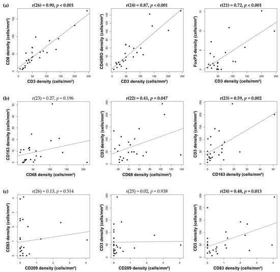 Unsurprisingly, we found a strong correlation between the CD3⁺-T-lymphocyte densities and those of the CD8⁺ cytotoxic T lymphocytes (r = 0.90, p < 0.001), CD45RO⁺ memory T lymphocytes (r = 0.87, p < 0.001) and FoxP3⁺ regulatory T lymphocytes (r = 0.72, p < 0.001) in the IDC-P tissues (Figure 4a). The CD8⁺ and CD45RO⁺ T-cell densities were also strongly correlated in the IDC-P tissues (r = 0.80, p < 0.001). The CD163⁺-M2-type-macrophage densities were not significantly correlated with the CD68⁺ cells (r = 0.27, p = 0.196; Figure 4b), nor were the CD209⁺ and CD83⁺ dendritic cells (r = 0.13, p = 0.514; Figure 4c). Interestingly, the T-lymphocyte densities in the IDC-P tissues were moderately correlated with the CD163⁺-M2-macrophage densities (r = 0.59, p = 0.002; Figure 4b) and, albeit to a lesser extent, with those of the CD83⁺ mature dendritic cells (r = 0.48, p = 0.013) (Figure 4c) and CD68⁺ macrophages (r = 0.41, p = 0.047; Figure 4b), but not with those of the CD209+ immature dendritic cells (r = 0.02, p = 0.938; Figure 4c).