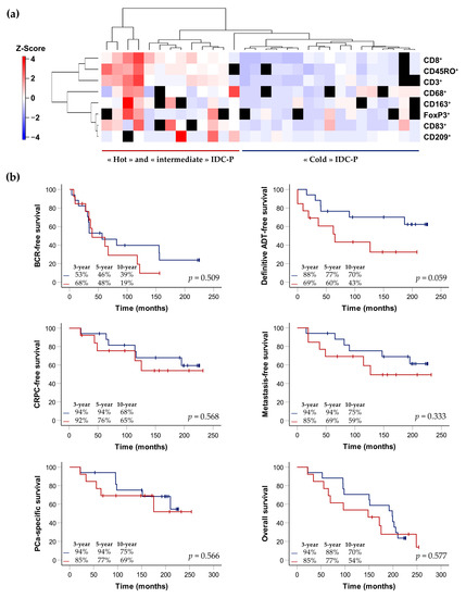 Hierarchical clustering of the three selected immune-cell markers according to cell densities in hotspots (a) and Kaplan–Meier curves exploring survival rates of patients with immunologically “cold/intermediate” IDC-P (blue) and patients with immunologically “hot” IDC-P (red), depending on the density in hotspots (b). (a) On the left side: cell-density scale from dark blue (low) to dark red (high). Each row corresponds to a patient and missing slides/quantification data are represented by black squares. One IDC-P-positive patient with two missing quantification data was excluded, bringing the total number of patients to 29. (b) The p-values were calculated using the log-rank test. Three-, five- and ten-year survival rates are indicated in the bottom left of each graph. ADT: androgen-deprivation therapy; BCR: biochemical recurrence; CRPC: castration-resistant prostate cancer; IDC-P: intraductal carcinoma of the prostate; PCa: prostate cancer.