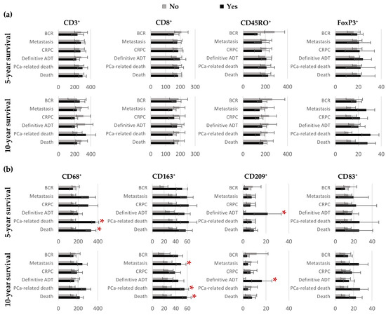 Bar charts representing the mean number of positive T cells (a) and antigen-presenting cells (b) in the total IDC-P according to patients’ outcomes five and ten years post-surgery. Error bars represent standard errors. For each cell marker, mean ranks according to survival status were compared using the Mann–Whitney U test and Benjamini–Hochberg corrections were applied to control for multiple comparisons. * Statistically significant p-values. ADT: androgen-deprivation therapy; BCR: biochemical recurrence; CRPC: castration-resistant prostate cancer; IDC-P: intraductal carcinoma of the prostate; PCa: prostate cancer.