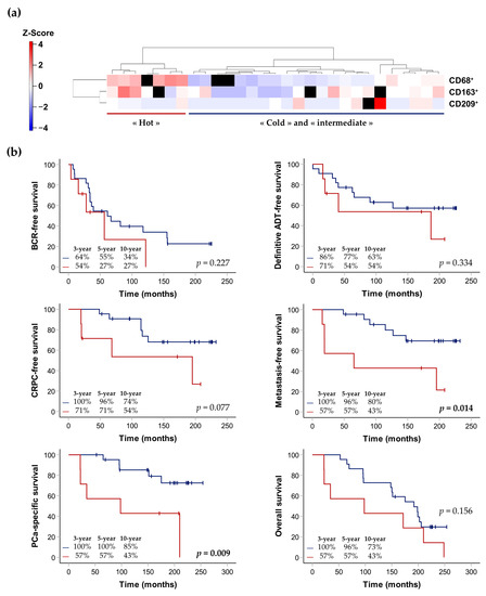 The immune signatures of the patients were generated using the cell densities of the three markers significantly associated with prognosis in the IDC-P-immune hotspots CD68, CD163 and CD209. One additional patient was excluded due to the absence of more than one IHC slide. Again, the cell densities in the IDC-P tissues were standardized using z-score normalization to generate a heatmap representing unsupervised hierarchical clustering. Two main groups were identified according to the expression of the three immune-cell markers in the hotspots: men with a low or intermediate expression of immune markers, constituting the “cold/intermediate” group; and men with a higher expression of immune markers, constituting the “hot” group, largely due to the presence of macrophages (Figure 8a).