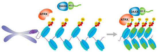 The ATRX-DAXX complex was reported to be a new ATP-dependent chromatin-remodeling complex, with ATRX as the main ATPase component and DAXX as the targeting subunit [49]. ATRX and its transcription cofactor DAXX were identified as a complex by immunoprecipitation from HeLa extract, and the complex exhibits ATP-dependent activities similar to those of other chromatin-remodeling complexes, such as DNA displacement and modification of mononucleosome disruption patterns [50]. DAXX attaches directly to H3.3 because its hydrophobic pocket is shallow enough to accept tiny hydrophobic Ala87 of H3.3, and its polar binding environment favors hydrophobic Gly90 in H3.3 over hydrophobic Met90 in H3.1 [51]. The ATRX-DAXX complex recognizes H3K9me3 via the ADD domain and is likely responsible for recruiting its binding partner DAXX into these areas for H3.3 deposition [52,53,54,55] (Figure 2).
