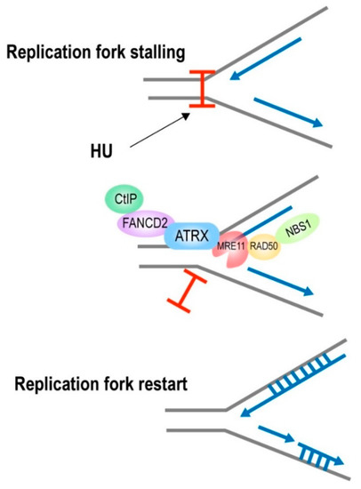 The DNA damage response (DDR) is a complex network of signaling pathways that cells establish to respond to exogenous or endogenous DNA damage that triggers genetic changes. ATRX works during DNA replication and is directly involved in DNA repair. ATRX deficiency increases sensitivity to agents, which induces replication stress [56]. Recent investigations have demonstrated that ATRX protects hydroxyurea (HU)-stalled replication forks and promotes their restarting [56,57,58]. ATRX is essential for proficient S phase progression by limiting fork stalling by recruiting to DNA damage sites and interacting with components of the MRE11-RAD50-NBS1 (MRN) complex, which has several known functions crucial for genomic stability and replication, such as the repair of double-strand breaks and the restart of a stalled replication fork [56,57].