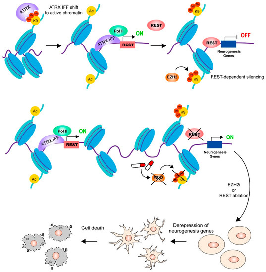 In addition to the detected point mutations and indels at the ATRX site, the large N-terminal deletions of ATRX generate in-frame fusion proteins (IFF), which lack several important chromatin interaction domains and contribute to aggressive neuroblastoma through reorganization of the chromatin landscape and result in transcriptional dysregulation. Recent research has demonstrated that ATRX in-frame fusion neuroblastomas are sensitive to the enhancer of zeste homolog 2 (EZH2) inhibition by modulating neuronal gene signatures [129]. ATRX has a helicase domain similar to SWI/SNF that modulates DNA accessibility [27]. The ATRX IFFs found in neuroblastoma lack most of these chromatin-binding modules, leading to alterations in their genomic binding. The ATRX IFF proteins are reallocated from H3K9me3-enriched chromatin to promoters of active genes, notably the RE-1 silencing transcription factor (REST). REST is a transcriptional repressor that binds to RE1 motifs, which are neuron-restrictive silencer elements [130,131]. The main function of REST is to suppress neuronal gene transcription in non-neuronal cells, which is important in neuronal development [132]. The research identifies REST as an ATRX IFF target whose activation increases the silence of genes involved in neuronal differentiation. Further evidence showed that REST deficiency and EZH2 inhibition enhance neuronal genes derepression and cell death (Figure 7). These findings support the notion that therapeutic targeting of ATRX IFF neuroblastoma with EZH2 inhibitors is a potential therapy for this aggressive neuroblastoma subtype.
