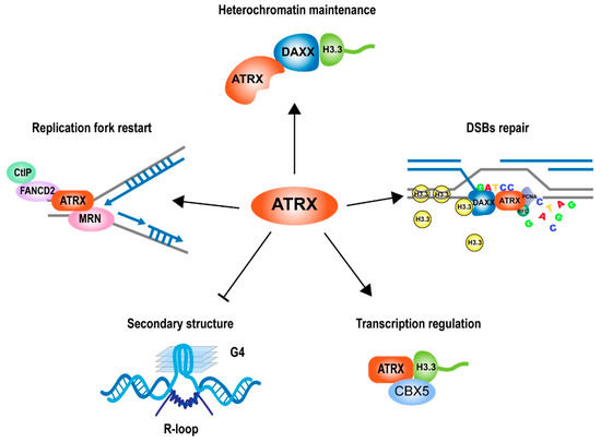 Since the ATRX gene was found, various functions of ATRX that are involved in many essential cellular pathways have been identified. ATRX functions as a chromatin-remodeling complex together with DAXX to deposit histone variant H3.3 at repetitive regions [52]. ATRX plays a crucial role the in the dynamic regulation of chromatin structure and the responses to replication stress and DNA damage repair (Figure 8). ATRX plays an essential role in chromatin remodeling, especially in the resolution of G4 DNA structures, but the detail of the molecular mechanism needs more research to be revealed. Although ATRX participates in DNA repair pathways such as HR and NHEJ, it remains unclear if ATRX promotes DNA repair through direct involvement in specific pathways or plays a role in controlling the balance or activity of different repair pathways. The disruption of ATRX has been related to several cancer alterations that contribute to cancer development and progression or resistance to treatment. In regard to the high frequency of ATRX mutations in cancer, the chromatin regulator appears to play a key role in pathogenesis. However, the details of how ATRX regulates cell fate decisions during development that go awry in cancer remain unclear. Given the diversity of mutations identified in ATRX, there remains a question of whether all mutations are loss-of-function, such as in-frame deletions of ATRX in neuroblastoma [129]. As the complete absence of ATRX is not tolerated in development, we must ask whether ATRX alterations are truly loss-of-function or if they are hypomorphic. Considering that ATRX is related to immunological responses in cancer, molecular studies focusing on this area will offer an opportunity to promote immunotherapy. This paper provides an overview of ATRX, including both structure and functions. More research is needed to investigate the role of ATRX in tumorigenesis and to reveal new therapeutic approaches.