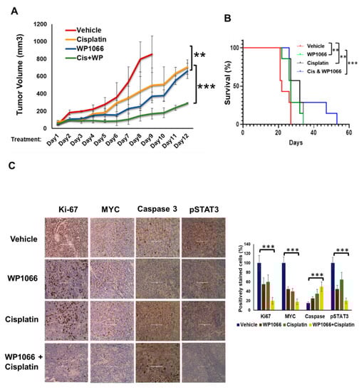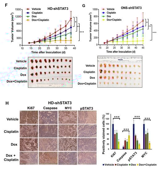 3.6. STAT3 Genetic Inhibition In Vivo Suppresses MB Tumor Growth and Sensitizes MB Tumor to Cisplatin