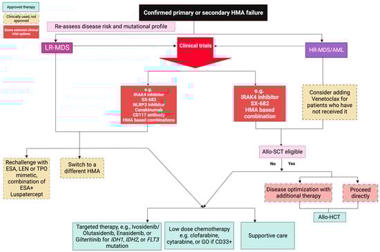 Management of MDS/AML post-HMA failure is complicated by the ongoing challenges in consolidating the biological and molecular heterogeneity of the disease. This includes disentangling the role of specific genetic mutations along a complex structure of gene–gene interactions [66,67]. Indeed, almost all MDS/AML patients harbor ≥1 mutation at the time of diagnosis, a situation even more complex at later stages whereby clonal evolution mechanisms may further complicate the molecular architecture [66,68]. This adds on to the extensive subclonal diversification and complexity underlying the mechanisms of resistance of primary and secondary HMA failure. In addition, most patients exhibit poor performance status, advanced age, and access to resources, all of which contribute to the overall dismal prognostic picture inherent to the biology of previously treated, advanced disease [69]. The difficulty of such a clinical scenario is substantiated by the dismal results obtained with several agents in randomized clinical trials. For instance, the phase 3 INSPIRE trial tested Rigosertib (ON-01910) in HR-MDS following HMA failure, resulting in no significant survival differences (6.4 vs. 6.3 months; p = 0.33) in patients treated with the experimental drug vs. physicians’ choice [70]. Rigosertib binds the RAS binding site of several kinases and subsequently blocks downstream cellular signaling implicated in tumorigenesis. Similarly, the use of different HMA formulations such as in the ASTRAL-3 trial using Guadecitabine showed no difference in the median OS (9.1 vs. 8.3 months in physicians’ choice group, p = 0.61), nor added clinically meaningful differences (secondary endpoints of 8-week transfusion independence, 12-month survival, leukemia-free survival, or duration of response in subjects with CR) [71]. Nevertheless, other alternative options and experimental therapies, are being explored and incorporated into the modern management of these patients (Figure 1) [69].