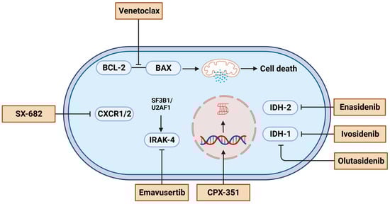 Several targeted therapies are currently studied either in preclinical or early clinical settings. Emavusertib (EMA) is a small molecule kinase inhibitor that blocks a serine/threonine kinase belonging to the interleukin one receptor-associated kinase four (IRAK4) family. Spliceosome mutations, such as SF3B1 and U2AF1, induce the expression of IRAK4, leading to a targetable, longer, oncogenic IRAK4 isoform in MDS/AML [109,110,111]. Of note, IRAK4 signaling downstream of the IL-1 receptor or toll-like receptor family leads to increased NF-kB activity and promotes the dominance of MDS clones and a transition to AML [112]. EMA is currently being investigated in a phase 1 trial “TakeAim Leukemia” (NCT04278768) [71]. The study involves 49 RR-HR MDS/AML patients with prior HMA use who are receiving twice daily 200–500 mg oral EMA. Of all patients, ORR was recorded at 57% and 40% in seven MDS and five AML patients who had splicing factors mutations, respectively, while ORR was 33% in the three AML patients with FLT3 mutations [71]. As phase 2 trials are being conducted, EMA has, thus far, demonstrated manageable safety and anticancer activity with a potential role in combination approaches in RR-HR MDS/AML [71].