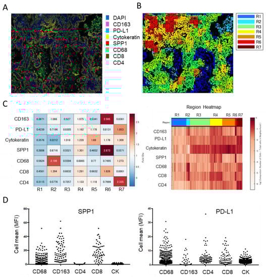 Multiplex immunofluorescent IHC analysis of lung adenocarcinoma. (A) IHC of CD163, PD-L1, cytokeratin, SPP1, CD68, CD8, and CD4 performed using the PhenoCycler™ (CODEX) system (AKOYA Bioscience, Marlborough, MA). (B) Spatial analysis of cluster neighborhood regions, with regions classified into 7 areas. (C) Tanle and Region Heatmap based on mean fluorescence intensity (MFI). MFI is normalized to the maximum MFI per neighborhood. (D) SPP1 and PD-L1 expression in each cell type presented in dot-blot graphs.
