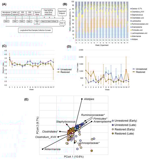 We longitudinally compared the microbial community changes following AOM/DSS administration between unrestored (no HMT) and restored (HMT from normal Balb/c fecal bedding swap once weekly during weeks 8, 9, and 10) groups. Mouse fecal pellets were longitudinally collected three times weekly for 17 weeks from Balb/c mice in unrestored n = 5 and restored n = 5 groups (Figure 1A). The overall mean percentage of the relative abundance of bacterial genera in restored and unrestored groups was relatively stable and similar (Figure 1B). Longitudinally, the microbial communities in mice with restored microbiota had significantly lower Shannon index values than unrestored mice (p = 0.035; Figure 1C); however, no significant differences were observed in Chao1 (p = 0.084; Figure 1D).