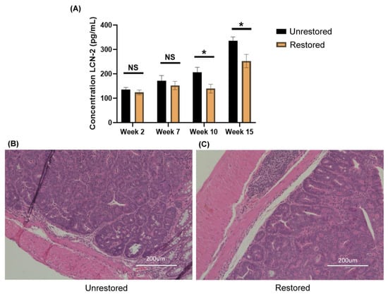 Fecal restoration alters colonic inflammation in Balb/c mice. (A) Fecal concentrations of Lcn-2 in unrestored (black) restored (orange) groups at weeks 2, 7, 10, and 15 (left to right) (* p < 0.05) (n = 3) (+/− SD). (B) Hematoxylin and eosin staining of the colon tissues of unrestored (C) Restored Balb/c mice.