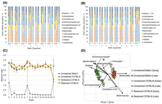 Next, we used Bray–Curtis dissimilarity and PCoA to compare restored and unrestored groups’ early and late microbial compositions. The early compositional signature between Balb/c and C57BL/6 unrestored animals differed significantly (ANOSIM R = 0.833, p < 0.001; Figure 3D). However, unrestored mice showed more similarity in late microbial compositions between Balb/c and C57BL/6 mice (ANOSIM R = −0.101, p = 0.723; Figure 3D). These observations suggested that even though C57BL/6 and Balb/c unrestored mice had significantly different initial microbial compositions after AOM/DSS treatment, similar compositions were observed between strains of mice when left untreated.