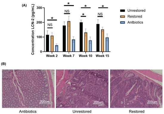 Fecal restoration modulates intestinal inflammation in C57BL/6 mice. (A) Fecal concentrations of Lcn-2 in unrestored (black), restored (orange), and antibiotics-treated mice (blue) in weeks 2, 7, 10, and 15 (left to right) (* p < 0.05) (n = 3) (+/− SD). (* p < 0.05) (NS p > 0.05) (B) Hematoxylin and eosin staining of the colon tissues of unrestored, antibiotics-treated, and restored C57BL/6 mice.