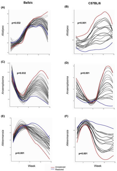 Longitudinally significant genera conserved between mouse genotypes. Longitudinal differences in the relative abundance of genera significantly differ between no restoration (red) and restoration (blue) groups as determined by SplinectomeR. (A) Alistipes, Balb/c (p = 0.032); (B) Alistipes, C57BL/6 (p = 0.001); (C) Anaeroplasma, Balb/c (p = 0.032); (D) Anaeroplasma, C57BL/6 (p = 0.001); (E) Akkermansia, Balb/c (p = 0.001); (F) Akkermansia, C57BL/6 (p = 0.001).