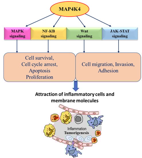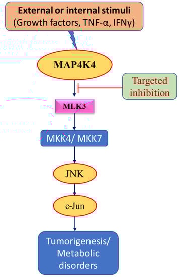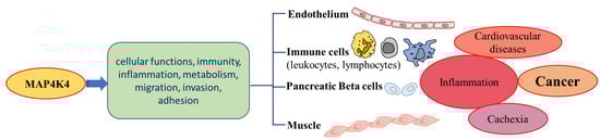 There are 22 members of the MAP3K family; including just a few, RAF, MEKK1, Tak1, MLK1, MLK2, MLK3, MLK4, and DLKs are known to regulate downstream MAP2Ks and MAPK-mediated signaling. The MAP3Ks can be regulated by their upstream regulators, MAP4K family members. There are several members of the MAP4K family, including MAP4K1, MAP4K2, MAP4K3, MAP4K4, MAP4K5 (germinal center kinase-related; KHS/GCKR), MAP4K6 (Misshapen-like kinase 1; MINK) and MAP4K7 (NCK interacting kinase; TNIK (MAP4K7) [9,10,11,12,13,14]. The role of the MAP4K family member MAP4K1 has been reported in various diseases, including viral infections and autoimmune and malignant diseases [15,16]. MAP4K2 has been implicated in diabetes-induced retinal vascular dysfunction and cardiotoxicity [17,18]. MAP4K3 has been reported in autoimmune diseases, inflammation, and cancers [19,20,21]. MAP4K4 is the most studied MAP4K family member, known for its role in malignancies [22,23], metabolic and cardiovascular diseases [24], diabetes [25], and antiviral immunity [26]. Another member of the MAP4K family, MAP4K5, has been implicated for its role in inflammatory disease, coronavirus disease 2019 (COVID-19) and malignancies [27,28]. MAP4K6 and MAP4K7 are involved in the Hippo pathway of tissue homeostasis and stress-induced JNK signaling in neuronal cells [29,30,31]. The present review will discuss the functional role of the most-studied MAP4K member, MAP4K4, in inflammatory and malignant diseases, including glioblastoma, colon, prostate, and pancreatic cancers and cancer-associated cachexia, and its possible use in targeted therapy.