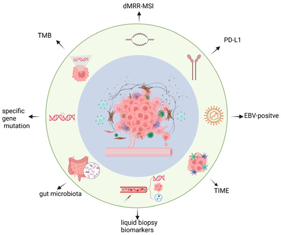 Overview of predictive biomarkers for immune checkpoint inhibitors in gastric cancer. Key elements on predictive biomarker progress for the efficacy of immune checkpoint inhibitors therapy are briefly precented in the figure, including PD-L1, dMRR/MSI, TMB, EBV-positive status, tumor immune microenvironment (TIME), specific genetic mutation, gut microbiota, liquid biopsy biomarkers.