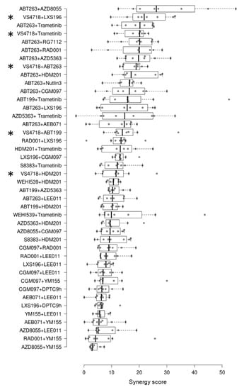 New ranking of drug combinations tested in uveal melanoma cell lines according to synergy scores. The screening of drug combinations was done in eight uveal melanoma cell lines. The FAK inhibitor (VS4718)-based combinations are indicated by asterisks. Each circle represents the synergy score for one cell line. The synergy scores of combinations not including the FAK inhibitor were previously reported in [27].