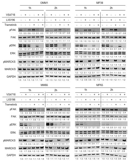 Immunoblot analysis for key signaling pathways in uveal melanoma. Immunoblotting of key signaling pathways in OMM1, MP38, MM66 and MP65 cell lines after 1 and 2 h of treatment with VS4718 (FAK inhibitor) at 1 µM, LXS196 (PKC inhibitor) at 500 nM or Trametinib (MEK inhibitor) at 5 nM alone or in combination. GAPDH is used as a loading control. Intensity readings of each band have been quantified by ImageJ (see Supplementary Table S5).