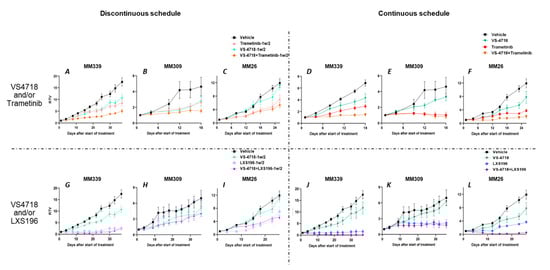 At day 18 or 26, as shown in Figure 4, VS4718 alone did not induce a significant decrease in tumor growth in MM309 and MM26, and there was a slight but significant reduction in tumor volume in the model MM339 under the discontinuous and continuous schedules (p < 0.05 for both schedules) (Figure 4A,G). At day 18 or 26, treatment with Trametinib alone resulted in a significant decrease in tumor growth in the three models when administered every week (Figure 4D–F). The PKC inhibitor LXS196 significantly reduced tumor growth in the three models and the two schedules, except for the MM309 model under the discontinuous schedule (Figure 4H). As shown in Figure 4, the reduction in tumor volume observed with Trametinib and LXS196 monotherapies was significantly higher with the continuous schedule as compared with the discontinuous one (p < 0.04) except for LXS196 in MM339 (Figure 4J).