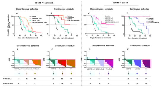 The overall efficacy of the combinations was further analyzed through the probability of progression time taken for tumors to quadruple in size (RTV × 4) and the overall response rate (ORR) considering all the mice included in the experiments (Figure 5). As observed in Figure 5A–D, the combination of VS4718 and LXS196 seems to result in a higher reduction in the probability of tumor progression as compared to the combination of VS4718 and Trametinib, but the differences are not statistically significant (p = 0.13).