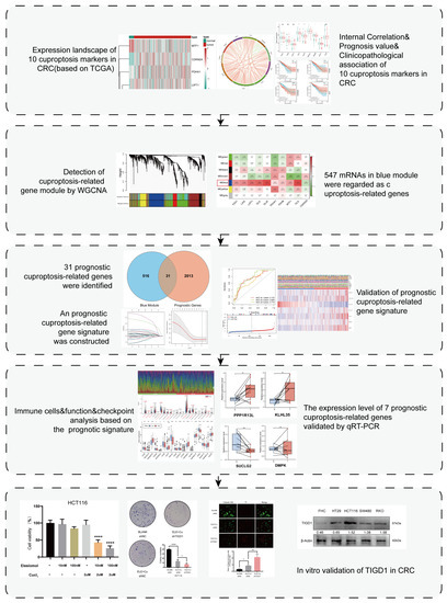 In this study, we comprehensively evaluated the overall landscape of cuproptosis regulation in CRC. Subsequently, we used weighted gene co-expression network analysis (WGCNA) to identify a hub module with 547 mRNAs that are closely correlated to the progression of cuproptosis in CRC. More importantly, we conducted least absolute shrinkage and selection operator (LASSO)–Cox regression analysis to further filter out seven novel genes and establish a cuproptosis-related mRNA prognostic signature. Further investigation revealed that TIGD1, a hub gene in our signature, could regulate cuproptosis in CRC.