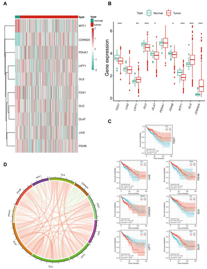 Expression landscapes of cuproptosis markers in CRC; (A) expression levels of ten cuproptosis CRC markers; (B) histogram of the ten differentially expressed cuproptosis markers in CRC; (C) Kaplan–Meier survival curves depict the OS rates of patients with CRC with high (red line) and low (blue line) expression levels of DFX1, LIAS, PDHB, CDKN2A, DLD, LIPT1, and DLAT; (D) chord graph depicting the Spearman correlation analysis of the ten cuproptosis CRC markers. * p < 0.05, ** p < 0.01, and *** p < 0.001.