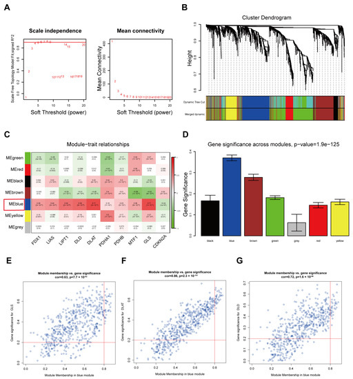 We used WGCNA to identify novel cuproptosis-related mRNAs in CRC. When the scale-free topology model fit reached >0.8, the soft-thresholding power was 7 (β = 7) (Figure 3A). We accordingly confirmed seven mRNA co-expression modules and evaluated their associations with ten cuproptosis markers (Figure 3B). The blue modules (547 mRNAs) were significantly correlated with all markers compared with the other modules (Figure 3C,D). All markers except CDKN2A were positively correlated with the blue module. Among these nine positively correlated genes, GLS, DLAT, and DLD shared high correlation coefficients (R = 0.63, 0.86, and 0.72, respectively) with the blue module (Figure 3E–G). The relationships between the remaining seven markers and the blue module are shown in Figure S2A–G. Thus, we identified a hub module with 547 mRNAs (Supplementary Table S2) that are closely correlated to the progression of cuproptosis in CRC.