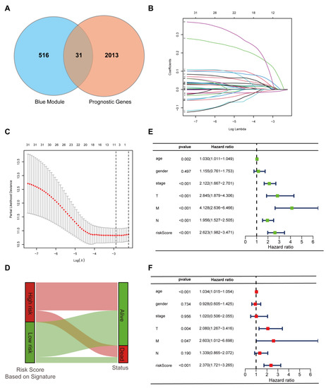 Construction of a 7-cuproptosis-related gene signature and the analysis of its independent prognostic potential; (A) Venn diagram identifying the common CRC prognostic genes and cuproptosis-related genes of CRC; (B) Cvfit curves showing LASSO coefficient profiles of the 31 candidate genes; (C) Selection of the optimal LASSO parameter lambda; vertical lines indicate the optimal values. (D) Sankey diagram representing the detailed connection between clusters, risk groups, and the live status of patients with CRC; (E,F) results of the univariate and multivariate Cox regression analyses with regard to the OS of the 7-cuproptosis-related gene signature. The red and green boxes stand for their harzard ratio.