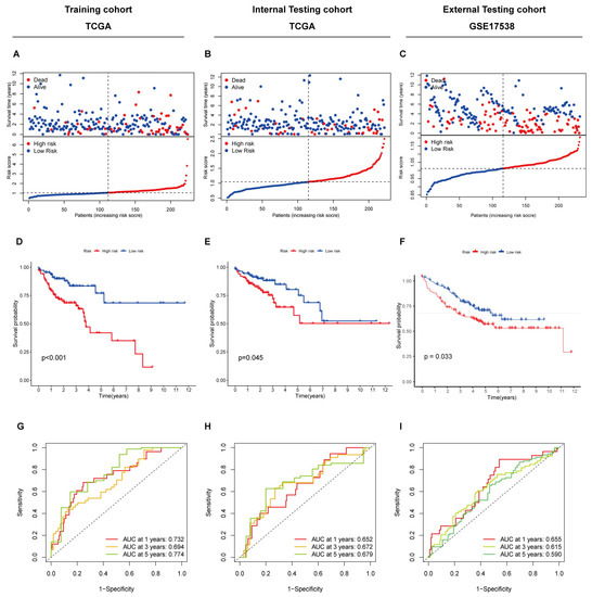 Subsequently, the distribution of the risk scores (above) and the distribution of OS rates (below) were demonstrated to indicate that patients with CRC were reasonably distributed between the high-risk and low-risk cohorts (Figure 5A–C). Kaplan–Meier survival curves were plotted to show that patients with CRC in the low-risk group had superior OS rates than those in the high-risk group in the training (Figure 5D), internal testing (Figure 5E), and external testing (Figure 5F) cohorts. A time-dependent ROC curve was also generated to validate the predictive effect of the cuproptosis-related gene signature. The areas under the curve (AUCs) were maintained at >0.65 at 1, 3, and 5 years in the training and internal testing cohorts (Figure 5G,H). AUCs were also maintained at >0.59 at 1, 3, and 5 years in the external testing cohort (Figure 5I). These results reveal that the prognosis-predictive accuracy of this signature was found to be robust in the training and testing cohorts.