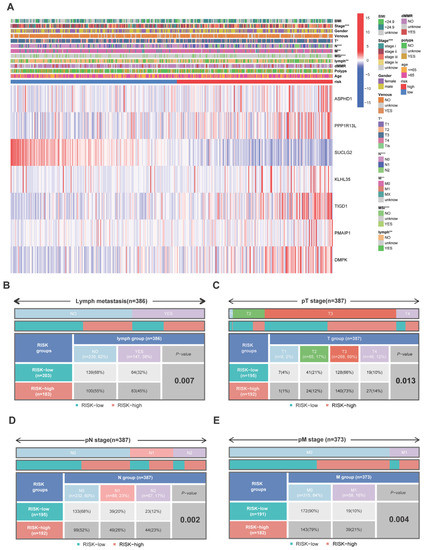 Correlation analysis between the prognostic signature and different clinicopathological characteristics in the TCGA cohort; (A) a heatmap of the distribution of 12 different clinicopathological characteristics of the risk groups of each patient based on the signature; (B–E) a rectangle diagram depicting the significant differences between the risk scores in patients with CRC stratified by lymph invasion, T stage, N stage, and M stage; * p < 0.05, ** p < 0.01, and *** p < 0.001.