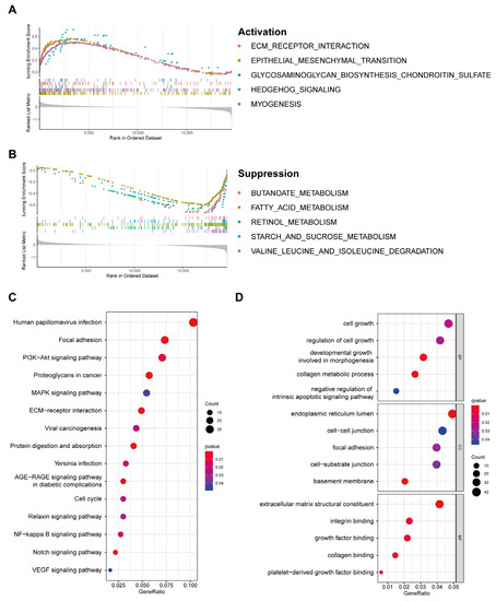 Biological, functional, and pathway enrichment analysis of the high-risk and low-risk groups based on the cuproptosis-related gene signature; (A) GSEA revealed significant enrichment of pathways activated in high-risk patients with CRC; (B) GSEA showing significant number of pathways suppressed in high-risk patients with CRC; (C) KEGG analysis revealing that many cancer progression pathways were enriched; (D) GO analysis showing the enrichment of many cancer-growth-related biological processes and molecular functions.