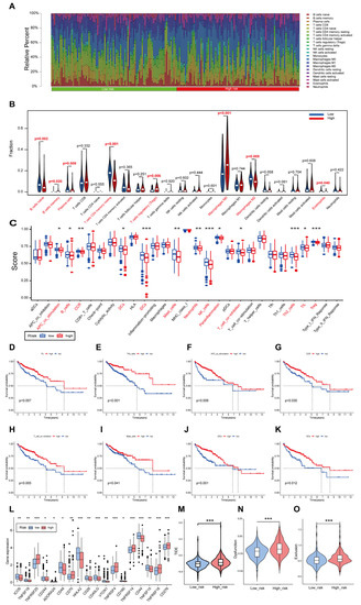 Analysis of immune-related landscapes in patients with CRC based on the cuproptosis-related gene signature; (A) bar graphs exhibiting the distribution of tumor-infiltrating immune cells between the high-risk and low-risk groups based on the cuproptosis-related gene signature; (B) Vioplot for comparing the 22 immune cells between the high-risk and low-risk groups of patients with CRC; (C) boxplots comparing the diverse immune cell subpopulations, related pathways, and functions between the high-risk and low-risk groups of patients with CRC; (D–K) Kaplan–Meier survival curves showing the OS rates of patients with CRC according to the differences of diverse immune cell subpopulations, related pathways, and functions; (L) boxplots for comparing immune checkpoint genes between the high-risk and low-risk groups; (M–O) Vioplot of TIDE results between the high-risk and low-risk groups of patients with CRC.* p < 0.05, ** p < 0.01, and *** p < 0.001.