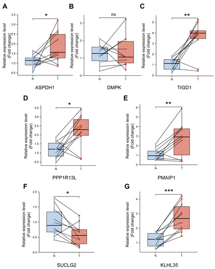 Validation of the expression levels of the seven PCRGs in patient samples; (A–G) qRT-PCR showing the expression of ASPDH1, DMPK, TIGD1, PPP1R13L, PMAIP1, SUCLG2, and KLHL35 in ten pairs of CRC tissue samples and adjacent normal tissues; (Blue box: pericardial tissues; red box: tumor tissue); * p < 0.05, ** p < 0.01, *** p < 0.001; ns, no significance.