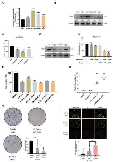 TIGD1 exhibits a high molecular weight in its signature, and its expression levels are remarkably different between CRC and pericardial tissues. We further explored its potential in cuproptosis regulation. Compared with fetal human colon (FHC) cells, the expression level of TIGD1 was significantly upregulated in CRC cell lines, especially in HCT116 cells (Figure 10A,B). Therefore, we induced the stable knockdown of TIGD1 using shRNA in HCT116 cells (Figure 10C,D). The expression level of TIGD1 in shTIGD1#2 was found to be the lowest; therefore, shTIGD1#2 was selected for follow-up research. A previous study reported that elesclomol can act as a copper ionophore and induce cuproptosis in cancer cells [15]. Accordingly, we evaluated whether elesclomol could induce cuproptosis in CRC cells. The CCK-8 assay indicated that the viability of HCT116 cells was inhibited on co-incubation with elesclomol and Cucl2, whereas neither standalone elesclomol nor standalone Cucl2 could blemish the viability of HCT116 cells (Figure 10E). Furthermore, the copper chelator tetrathiomolybdate liberated the viability of HCT116 cells on incubation with elesclomol; other cell-death inhibitors, including Q-VD-Oph, ferrostatin-1, necrostatin-1, and 3-methyladenine, failed to reverse cell death. These results indicate that elesclomol and Cucl2 could successfully induce cuproptosis. Subsequently, after the exogenous administration of elesclomol and Cucl2, we examined the intracellular Cu levels and found that they statistically increased in the shTIGD1 group (Figure 10F). Furthermore, on incubation with elesclomol and Cu2+, the growth and colony-formation capacity of HCT116 cells could be significantly inhibited in the shTIGD1 group (Figure 10G). The calcein-AM/PI assay also revealed similar results, indicating that shTIGD1 could promote cuproptosis (Figure 10H). Altogether, these data suggest that TIGD1 knockdown might further promote cuproptosis in CRC cells.