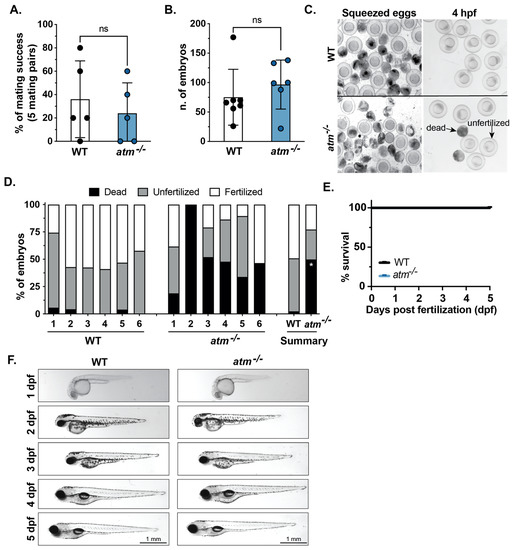 atm mutation is well tolerated in zebrafish embryos. (A) The percentage of mating success calculated from 5 individual pairs over 6 independent matings for WT and atm−/− mutants. Each dot indicates the average success of each mating pair based on the production of any embryos. (B) The number of embryos generated for paired mating of WT and atm−/− adults. Each dot indicated a different mating. (C) Images of WT and atm−/− mutants after squeezing and at 4 h post-fertilization (hpf) showing fertilized, unfertilized and dead embryos. (D) Stack bar indicates dead, fertilized, and unfertilized as categorized in panel C for individual mating pairs of WT and atm−/− mutants. Summary stack bars show the average of each phenotype for WT and atm−/− mutants. (E) Survival curve of WT and atm−/− mutants from 1 to 5 dpf indicates no significant differences between fertilized embryos of WT and atm−/− mutants. (F) Representative images of live WT and atm−/− mutants from 1 to 5 dpf show no observable morphological differences are detected. Values are expressed as the mean ± SD and were compared by unpaired t-test. Significant differences are indicated as follows: ns p > 0.05 (non-significant), * p < 0.05.