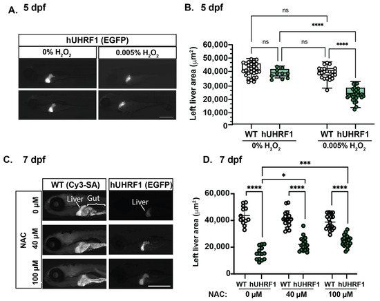 The small liver phenotype caused by hUHRF1 overexpression is enhanced by H2O2 exposure and reversed by NAC treatment. (A) hUHRF1 transgenic larvae and their non-transgenic siblings were untreated or treated with 0.005% H2O2 for 40–42 h and collected at 120 hpf. The left liver area was measured using the EGFP fluorescence (hUHRF1 transgenics) or CY3-SA staining (WT). (B) Left liver lobe area is significantly smaller in hUHRF1 larvae treated with 0.005% H2O2 compared to non-transgenic siblings treated with H2O2 and compared to untreated hUHRF1 larvae. The median is indicated by the horizontal line in the box and the whiskers represent the range of measurements. (C) hUHRF1 transgenic larvae and their non-transgenic siblings were untreated or treated with 40 or 100 μM of NAC from 4 dpf to 7 dpf and imaged at 7 dpf for left liver area on EGFP fluorescence (transgenics) or CY3-SA staining (controls). (D) Liver size is significantly smaller in hUHRF1 larvae compared to non-transgenic siblings at 7 dpf and NAC treatment increases the size of the liver in transgenic larvae. Experiments were performed in 2–3 clutches with at least 9 animals per clutch. Each dot represents 1 liver. Scale bar: 500 µm. Values are expressed as the mean ± SD and were compared by two-way ANOVA with Tukey’s multiple comparisons test (B,D). Significant differences are indicated as follows: ns p > 0.05 (non-significant), * p < 0.05, *** p < 0.001, **** p < 0.0001.