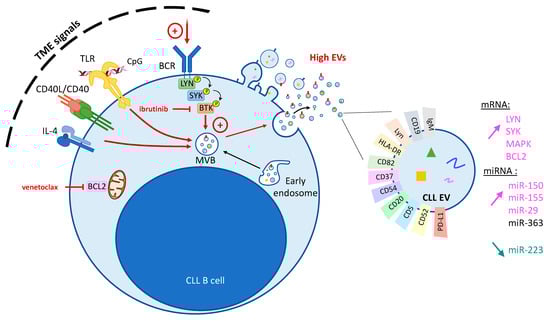 Modulation of EVs in CLL. The fusion of MVBs (multivesicular bodies) with plasma membrane or the budding of the plasma membrane leads to the release of CLL EVs from CLL B cells. EVs’ release can be increased by TME (tumor microenvironment) signals recapitulated by the stimulation of the BCR (B-cell receptor), TLR (Toll-like receptors) signaling, or CD40/IL-4 (left panel). CLL EVs are characterized by the exposure of specific surface markers (right panel). Compared to normal B cell EVs, CLL EVs contain a higher level of LYN, SYK, MAPK and BCL2 mRNAs, as well as a higher level of miR-150, miR-155, and miR-29 but a lower level of miR-223. TME stimulation increases their miR-363 content (BTK—Bruton’s tyrosine kinase; LYN—Lck/Yes novel tyrosine kinase; SYK—spleen tyrosine kinase).