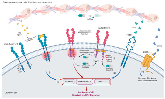 - Friedman, R. The molecular mechanisms behind activation of FLT3 in acute myeloid leukemia and resistance to therapy by selective inhibitors. Biochim. Biophys. Acta (BBA)-Rev. Cancer 2021, 1877, 188666. [Google Scholar] [CrossRef]