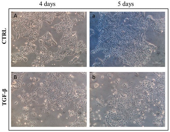 TGF-β1 triggers morphological changes in MCF-10A cells after five days of induction. Images on light microscopy of MCF-10A cells. In physiological conditions, epithelial cells are polarized, display a cuboidal-like morphology, and interact with each other through cell–cell junction (A,a). Upon TGF-β1 addition, cells lose cell–cell junction, and apico–basal polarity assumed a fibroblast-like morphology and became scattered over the entire area (B,b), thereby losing reciprocal connectivity and the tissue-like architecture.
