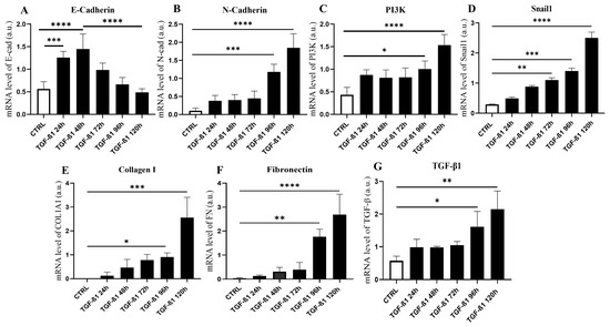 TGF-β1 triggers modulation of epithelial and mesenchymal marker expression. The mRNA levels of E-cadherin (A), N-cadherin (B), PI3K (C), Snai1 (D), Collagen (E), Fibronectin (F), and TGF-β (G) in the control and TGF-β1-treated MCF-10A cells at different time points. Following TGF-β1 treatment, noncancerous breast cells progressively lose the epithelial features, acquiring mesenchymal hallmarks, such as De Novo expression of N-cadherin, increased synthesis of Snai1, and reduced expression of E-cadherin. Noting that once the transformation process has reached a steady stae (i.e., 120 h), the system requires a very relevant increase in PI3K activity. Moreover, EMT is accompanied by a significant change in collagen and fibronectin release that can, in turn, modify the microenvironment architecture. Histograms are expressed as relative expressions of three independent experiments (mean ± SEM). GAPDH was used for housekeeping. One-way ANOVA statistical analysis: * p < 0.05; ** p < 0.01; *** p < 0.001; **** p < 0.0001.
