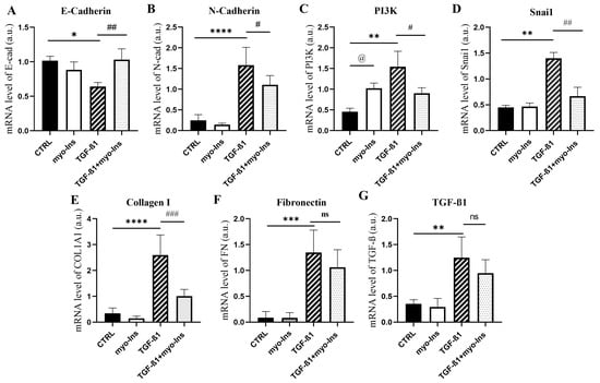 Myo-Ins downregulates the expression of mesenchymal parameters induced by TGF-β1. qPCR-evaluating levels of E-cadherin (A), N-cadherin (B), PI3K (C), Snail (D), Collagen (E), Fibronectin (F), and TGF-β1 (G) in MCF-10A cells treated with TGF-β1 alone or in combination with myo-Ins. The addition of myo-Ins induces, as early as after one hour, a significant reversion of all but one (fibronectin) of the investigated parameters. This result indicates that myo-Ins exerts a pleiotropic effect upon several pathways instrumental in fostering the mesenchymal–epithelial transition (MET). Histograms are expressed as relative expressions of three independent experiments (mean ± SEM). GAPDH was used for housekeeping. One-way ANOVA statistical analysis: * p < 0.05; ** p < 0.01; *** p < 0.001; **** p < 0.0001. # p < 0.05; ## p < 0.01; ### p < 0.001; @ p < 0.05; ns: no significance. Legend: *: TGF-β1 vs. CTRL; # TGF-β1+myo-Ins vs. TGF-β1; @: myo-Ins vs CTRL.