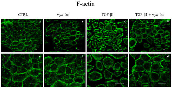 Epithelial cells undergoing EMT assume a typically mesenchymal-like shape and lose their apico–basal polarity [25]. TGF-β1 fosters a significant remodeling of cortical F-actin, given that cells undergoing EMT show an almost uniform redistribution of actin while losing their polarity. Moreover, the presence of stress fibers increases significantly (Figure 4C,c). In addition, we observed that those cells displayed protruding edges from the cell surface. Cells adopt a characteristic mesenchymal, sharp shape, displaying several kinds of invading structures (invadopodia, lamellipodia, and pseudopodia). Whereas myo-Ins does not influence actin distribution in the control samples (Figure 4A,a), inositol almost completely reverts F-actin changes induced by TGF-β1 (Figure 4B,b). Additionally, TGF-β1 fosters the organization of F-actin in stress fibers, while inositol inhibited the emergence of both stress fibers and lamellipodia/invadopodia (Figure 4D,d).