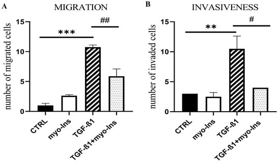 Samples of 2.5 × 104 cells, control (CTRL), and stimulated with either 10 ng/mL TGF-β1, 4 mM myo-Ins as a single agent, or with both TGF-β1 and myo-Ins, were placed in 500 µL of DMEM-F12 supplemented with 0.1% horse serum in the upper side of 8-µm filters (Falcon, BD Biosciences, San Jose, CA, USA) (upper chamber), and placed in the wells of a 24-well (lower chamber), containing 0.8 mL of DMEM F12 + 5% horse serum. After 24 h of incubation, the migratory cells on the lower surface of membranes were fixed and stained with Hemacolor® (HX54775574, Merck, Darmstadt, Germany) following the manufacturer’s instructions. Cell migration was determined by counting the number of cells on the membranes in at least 4–5 randomly selected fields using a Zeiss LSM 900 Confocal Microscope Airyscan 1 (Oberkochen, Germany) optical microscope. For the invasion assay, 2.5 × 104 cells were seeded in 500 µL of DMEM-F12 supplemented with 0.1% of horse serum on the upper surface of the transwells containing Matrigel (BD Bio-CoatTM growth factor reduced MATRIGEL TM invasion chamber, BD Bioscences-Discovery Labware, two Oak Park, Bedford, MA, USA). Transwells were located on a 24-well plate (Falcon, BD Biosciences) containing 0.8 mL of the same culture medium, supplemented with 5% horse serum used as a chemoattractant. After 24 h of incubation, Matrigel invading cells were stopped, fixed, and stained with Hemacolor® (following the manufacturer’s instructions), and then analyzed by optical microscope (Zeiss LSM 900 Confocal Microscope Airyscan 1). The cellular invasion was determined by counting the number of cells on the membranes in at least 4–5 randomly selected fields using a Zeiss Zeiss LSM 900 Confocal Microscope Airyscan 1 optical microscope.
