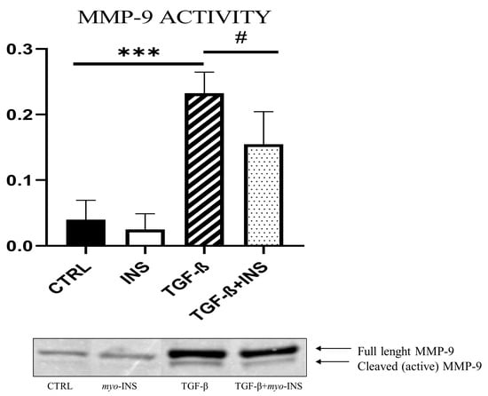 Myo-Ins decreases the proteolytic activity of MMP9. The histograms represent the MMP-9 activity in MCF-10A cells and in control MCF-10A cells treated with TGF-β1 alone or in combination with myo-Ins. Whereas TGF-β1 induce a five-fold increase in MMP-9 release, myo-Ins significantly mitigates this effect by ~40%. One-way ANOVA statistical analysis: *** p < 0.001. The uncropped blots are shown in Figure S2. # p < 0.05. Legend: *: TGF-β1 vs. CTRL; #: TGF-β1+myo-Ins vs. TGF-β1.