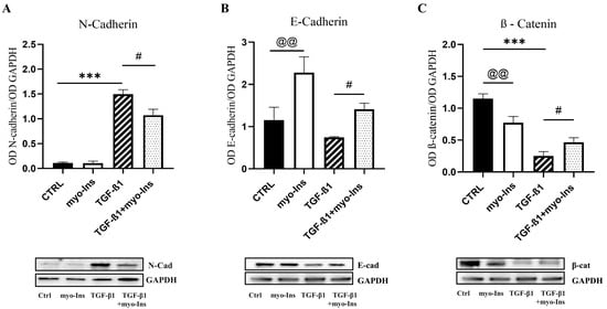 Myo-Ins regulates the expression of cell-to-cell junction markers when added after five days of TGF-β1 induction. Graphs representing Western blot relative expression of N-cadherin (A), E-cadherin (B), and β-catenin (C) in MCF-10A cells treated with TGF-β1 alone or in combination with myo-Ins for six hours of three independent experiments (mean ± SEM). The treatment with myo-Ins significantly (−40%) reduces the expression of N-cadherin, while promoting the expression of E-cadherin up to the level shown by the control samples. Moreover, myo-Ins rescues the TGF-β1-induced inhibition upon β-catenin. Although β-catenin increases up to two-fold when compared to transformed cells, the pre-TGF-β1 values are not reached after myo-Ins treatment. Each sample has been normalized by using the relative expression for GAPDH. *** p < 0.001 (One-way ANOVA). The uncropped blots are shown in Figure S2. # p < 0.05; @@ p < 0.01. Legend: *: TGF-β1 vs. CTRL; # TGF-β1+myo-Ins vs. TGF-β1; @: myo-Ins vs. CTRL.