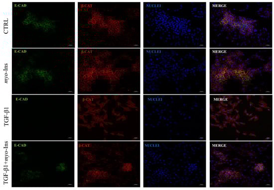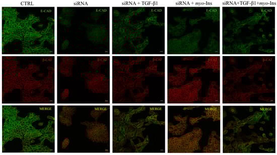 Transient transfections were performed using Lipofectamine™ RNAiMAX, Invitrogen™, and siRNA of CDH1 (E-cadherin) (Ambion™ by Life Technologies, Carlsbad, CA, USA) in 250 μL of Opti-MEM™ (Gibco™) according to manufacturer’s instructions. Then, 250 μL of lipofectamine and siRNA were added at T0 directly in the cell-culture medium, and after 1 h, TGF-β1 was added. Upon five days of TGF-β1 and siRNA treatment, 4 mM of myo-Ins was added for six hours. The process was stopped at 120 h of transfection. Further, β-catenin and E-cadherin were investigated with confocal microscopy as previously described.