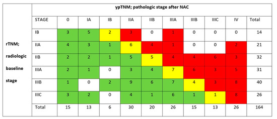 Cross-tabulation of the CT stage at diagnosis (rTNM) vs. the definitive pathological stage (ypTNM), n = 164. Green: response, downstaged (n = 78); yellow: stable disease (n = 25); red: progression, upstaged (n = 61).