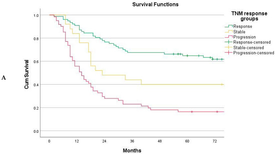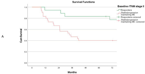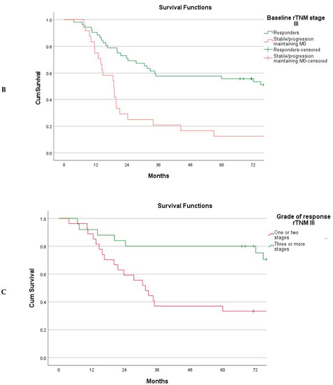 The TNM response mode did achieve the objective of stratifying patients into groups of significantly different long-term survival rates (Figure 3A). The 5-year overall survival rates were 65.3% (95% CI 54.7–75.9%) for the responders, 40.0% (95% CI 20.8–59.2%) for stable disease, and 14.8% (95% CI 6.0–23.6%) for disease progression, with a global log-rank p-value of ˂0.001. Subdividing patients with disease progression into those maintaining the M0 status versus those progressing to M+ disease, survival in the M0 subset was similar to that of patients with stable disease (p = 0.512) (Figure 3B). Survival for the responders was further compared to that for the merged group (stable disease + progression maintaining M0), with an improved survival rate for the responders as a sustained finding across the individual baseline rTNM stages (Figure 4A,B) and graded according to the number of tiers downstaged (Figure 4C).