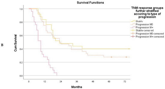(A) Overall survival stratified on the basis of the TNM response mode, n = 164. Response (n = 78), stable disease (n = 25), and progression (n = 61). Global log-rank p < 0.001. Response vs. stable p = 0.012. Stable vs. progression p = 0.020. (B): Overall survival based on TNM response mode. Disease progression further subdivided into progression maintaining M0 status (n = 35) and progression to metastatic disease M+ (n = 26). Stable disease vs. progression maintaining M0, log-rank p = 0.512.