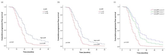 Numerous studies have shown that a low LMR predicts a shorter PFS, whereas a high LMR indicates a longer PFS in ovarian cancer [,,,]. Zhu et al. performed a large cohort multicenter study about peripheral blood LMR in 672 patients with advanced epithelial ovarian cancer [] and found that a low LMR is associated with a poor response to neoadjuvant chemotherapy and a worse disease progression. Eo et al. also retrospectively examined bLMR as a prognosticator in a cohort of 234 patients with epithelial ovarian cancer who have undergone a debulking surgery []. Their data showed that low LMR was significantly correlated with a poor disease progression. In our study, univariate analysis revealed that PFS was significantly influenced by bLMR and mLMR. Furthermore, multivariable analysis confirmed that only the bmLMR score was an independent predictor of disease progression.